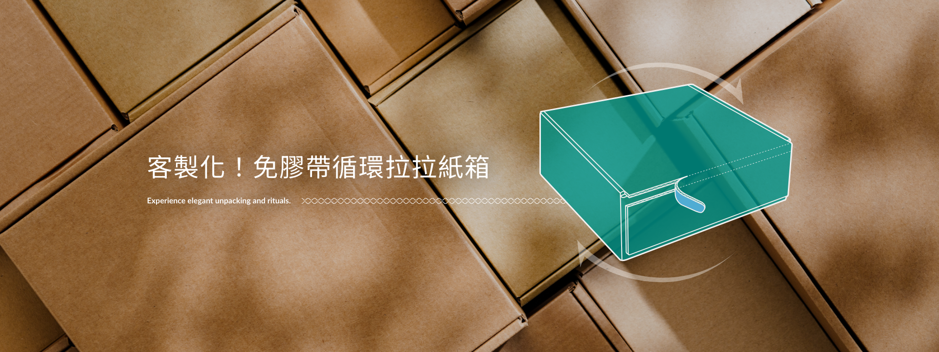 在當今AI電子商務時代,我們開發出符合國內外環保趨勢下的『免膠帶循環拉拉紙箱』,提供品牌客製箱型尺寸和循環次數,並以撕拉條雙面膠取代封箱膠帶,一撕即成無塑包裝!